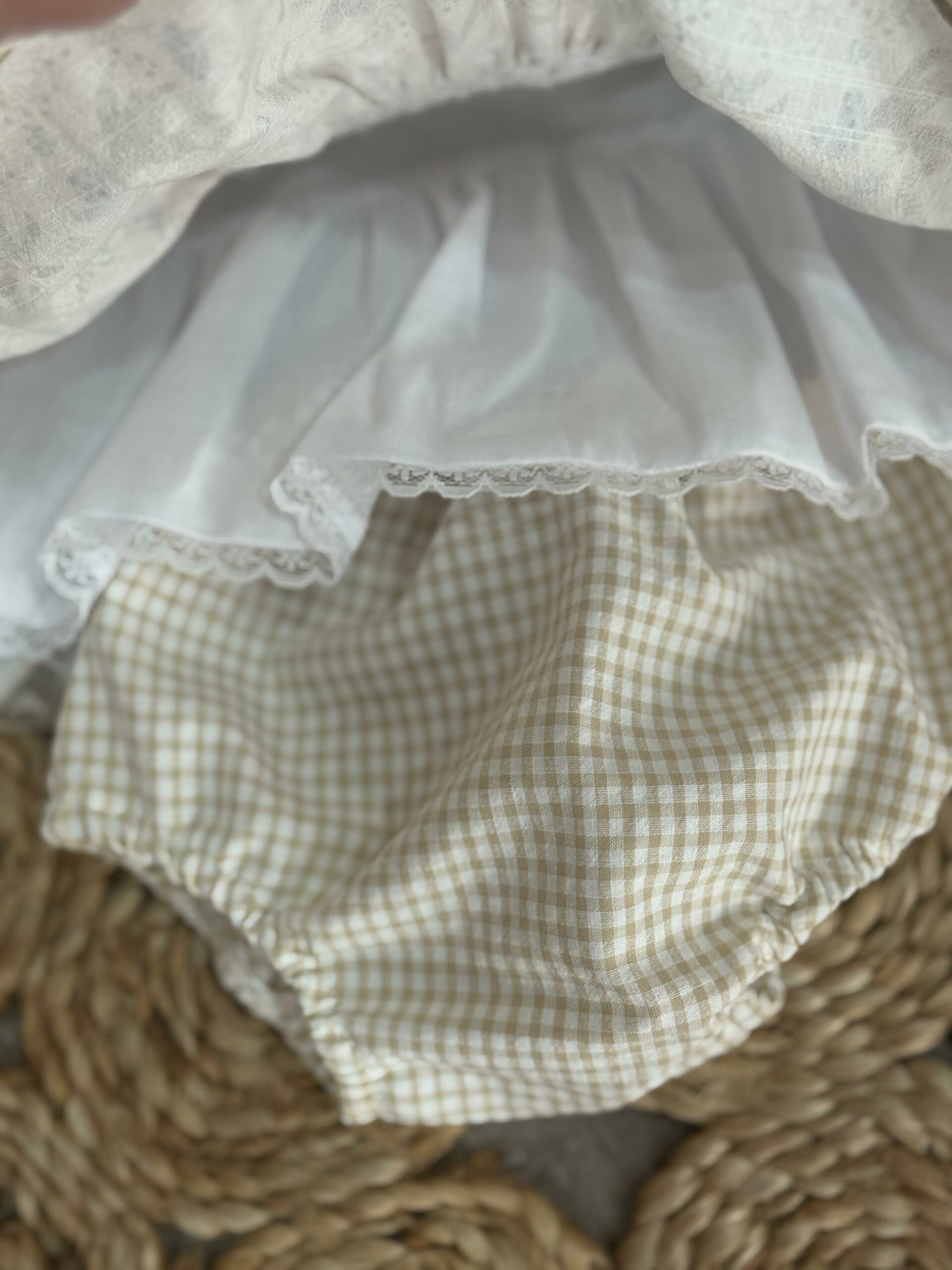 Nuestro jesusito de dos piezas combina el delicado tejido liberty con el clásico vichy en tono arena, creando un conjunto dulce, elegante y atemporal.
